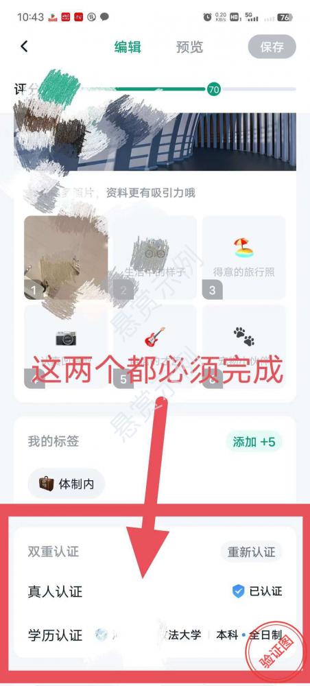完善信息,性别不能选错,头像必须正脸照,自己的别人的都行,但要看着真实才会通过。信息尽量真实。然后完成实名认证和认证学历!!提交后让客服审核,连续发送两次“人工客服”触发在线人工,这个截图通过“我的”点击头像进去就看到了。