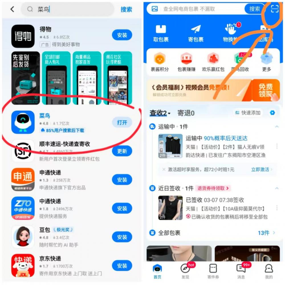 打开菜鸟--首页,右上角扫一扫下面二维码