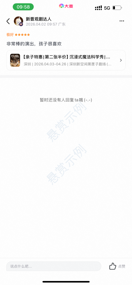 大麦app微信app淘宝app扫码围绕着魔术秀给五星好评,只要求15-30字,不需要加图片,五星好评是硬性条件,不五星的话一律举报拉黑,加图片一律拉黑举报封号